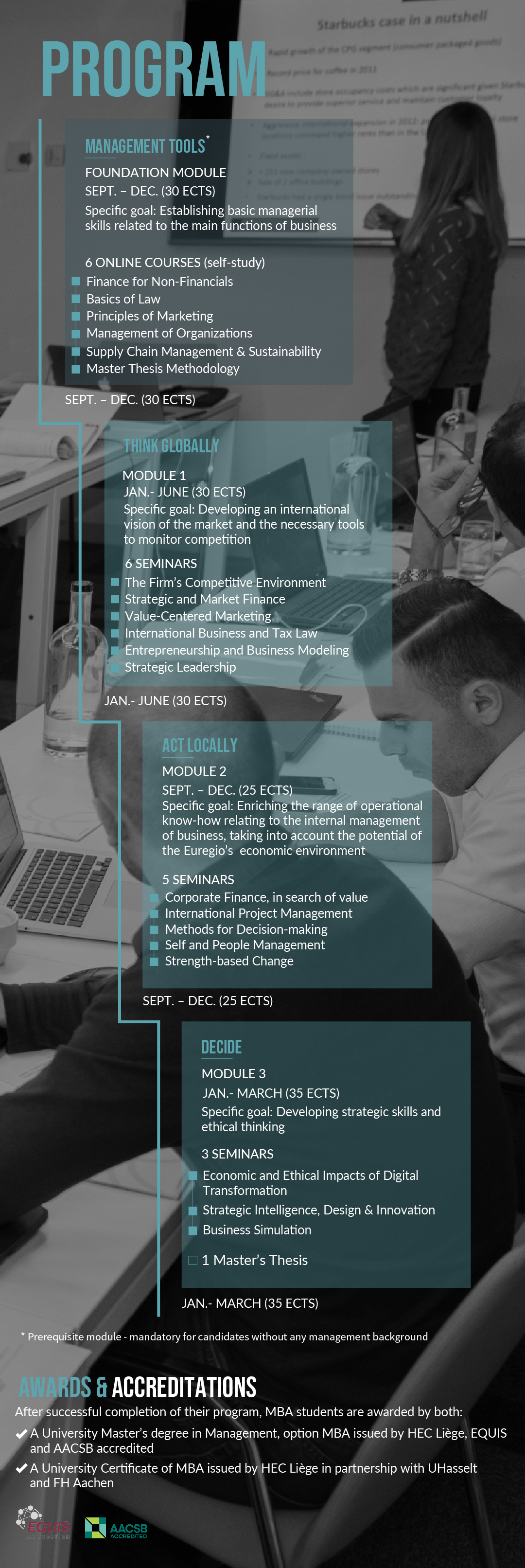 Interactions between our MBA students and the company they work for are highly encouraged for the seminar preparation (working on concrete company's projects, coaching for problem-solving, extending your company's network, assignments on different aspects of your company, sharing new skills and ideas with colleagues, etc.).